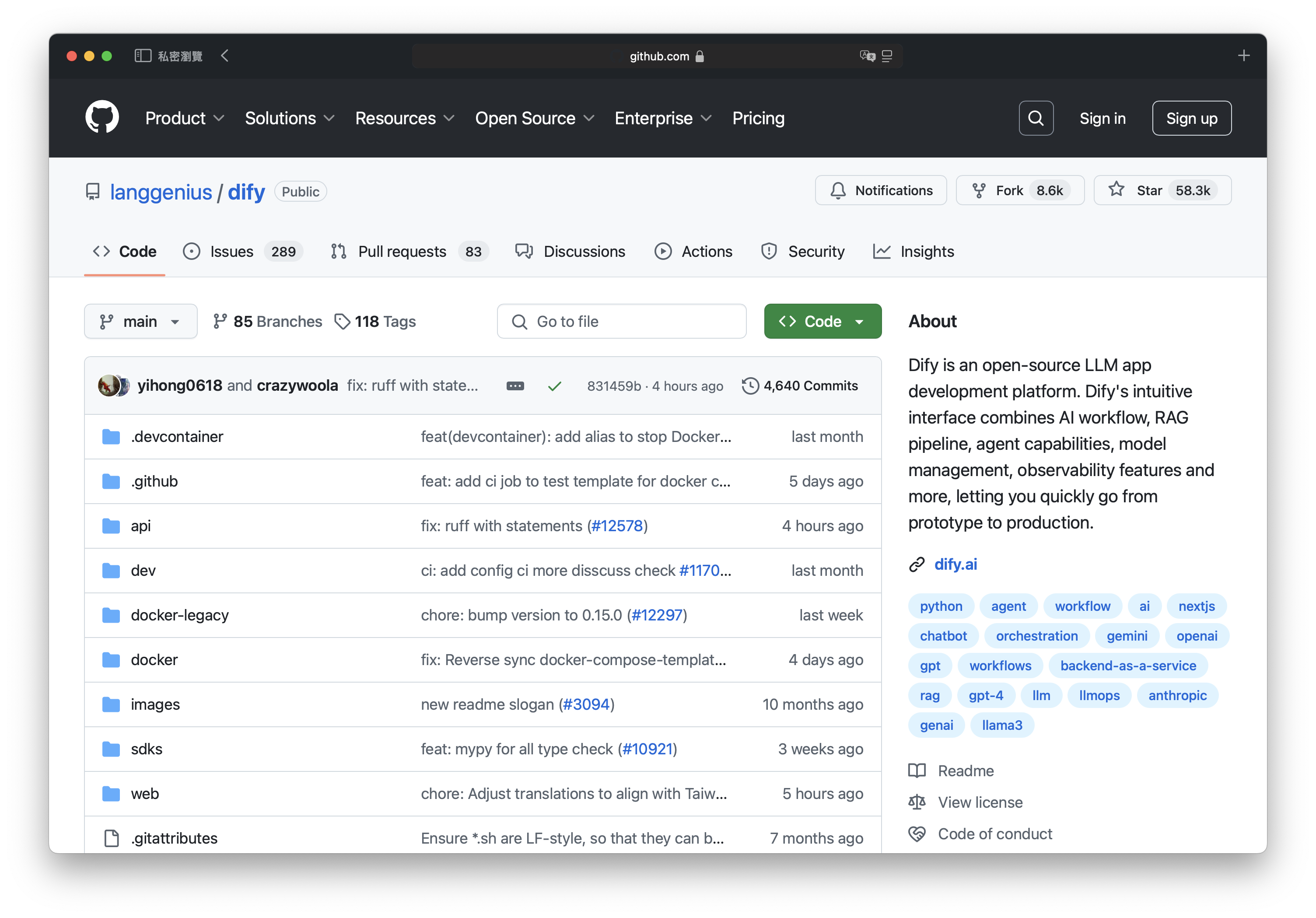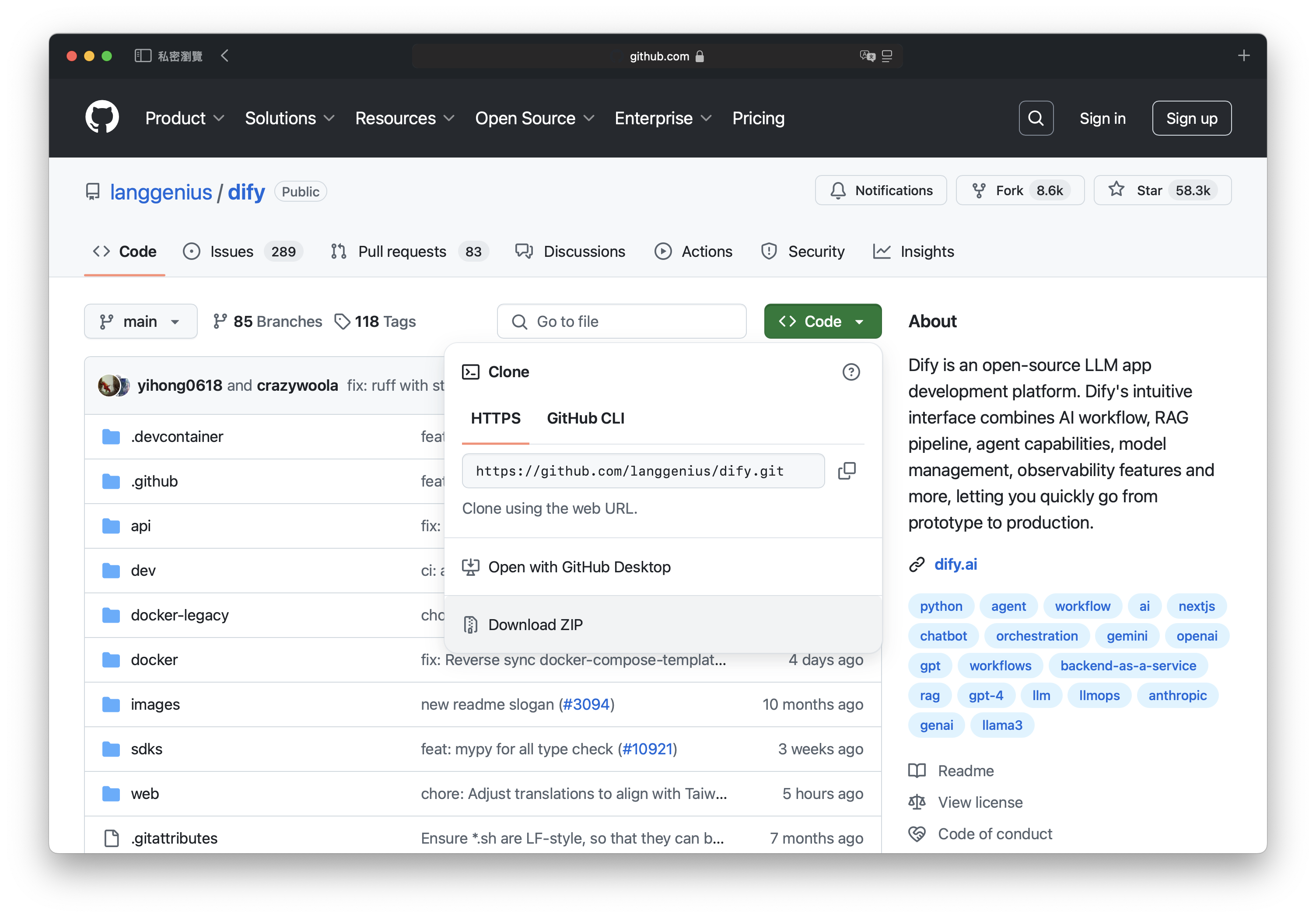 用瀏覽器(Google Chrome / Safari)開啟此網頁:https://github.com/langgenius/dify